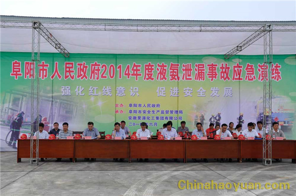 2014年6月26日上午,昊源集團(tuán)在4#尿素裝置現(xiàn)場舉行液氨泄漏事故應(yīng)急救援演練。省安監(jiān)局、阜陽市政府、市安監(jiān)局、質(zhì)監(jiān)局、潁東區(qū)及市直相關(guān)單位領(lǐng)導(dǎo)親臨演練現(xiàn)場觀摩指導(dǎo)演練。