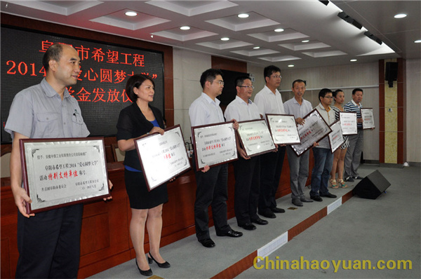 由團(tuán)市委舉辦的希望工程“愛心圓夢(mèng)大學(xué)”行動(dòng),是為幫助家庭困難、成績優(yōu)秀的大學(xué)新生順利跨進(jìn)大學(xué)校門開展的一項(xiàng)公益助學(xué)活動(dòng),至今已連續(xù)舉辦九年。昊源公司作為參與愛心圓夢(mèng)助學(xué)活動(dòng)愛心的企業(yè),連續(xù)九年資助90余名貧困大學(xué)生,圓了他們的大學(xué)夢(mèng)。儀式上,方旭等為受助學(xué)生代表發(fā)放了助學(xué)金,為昊源集團(tuán)頒發(fā)了獎(jiǎng)牌?!?br />