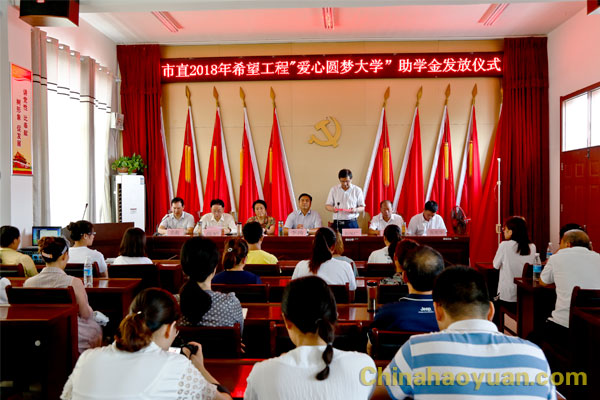 阜陽市直機關工委領導李濤、周君、劉振、高爐、余彪,昊源公司副總經(jīng)理田懷廣、椿樹村委書記張明華出席助學金發(fā)放儀式。