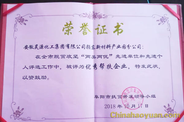 近日,阜陽市扶貧開發(fā)領(lǐng)導小組對全市脫貧攻堅“兩美兩優(yōu)”先進單位和先進個人進行評選表彰,安徽昊源化工集團有限公司潁東新材料產(chǎn)業(yè)園分公司獲評“優(yōu)秀幫扶企業(yè)”榮譽稱號。