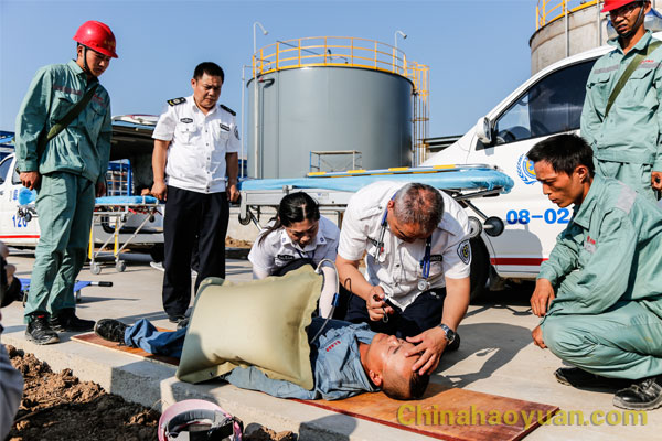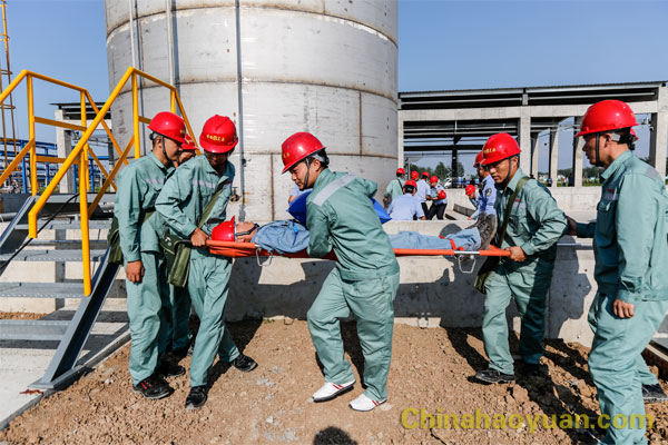 演練假想昊源公司園區(qū)正在建設(shè)的年產(chǎn)6000噸二甘醇胺項(xiàng)目配套罐區(qū),某防腐公司4名員工對(duì)在建二甘醇胺儲(chǔ)罐內(nèi)部進(jìn)行防腐受限空間作業(yè),因天氣炎熱,通風(fēng)不良,2名工人在罐內(nèi)工作時(shí)先后暈倒,外面監(jiān)護(hù)的1名工人呼叫沒有反應(yīng),隨即進(jìn)入罐內(nèi)施救,罐外還留一名工人監(jiān)護(hù)。進(jìn)入罐內(nèi)救援的工人告訴外面監(jiān)護(hù)人員,罐內(nèi)悶熱,呼吸困難,正準(zhǔn)備將2名工人移出罐外,但是在移動(dòng)罐內(nèi)人員時(shí)感覺乏力,無法移動(dòng),施救人員也暈倒在罐內(nèi)。罐外監(jiān)護(hù)的工人趕緊尋求幫助,正好遇見路過此處巡檢的操作人員,操作人員迅速了解情況,緊急將情況匯報(bào)公司領(lǐng)導(dǎo)。公司領(lǐng)導(dǎo)立即組織人員自救,聯(lián)系120急救中心人員救援,并逐級(jí)向市應(yīng)急局、市政府匯報(bào)事故情況。