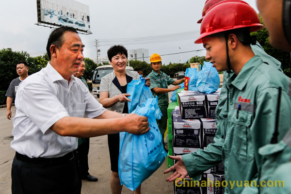 孫正東一行在凡殿才等公司領導陪同下,來到航天爐生產(chǎn)系統(tǒng),慰問正在生產(chǎn)崗位工作的昊源干部、員工,關切地詢問他們的工作、生活情況,叮囑他們注意高溫作業(yè)安全,并親自將防暑降溫用品送到他們手里。