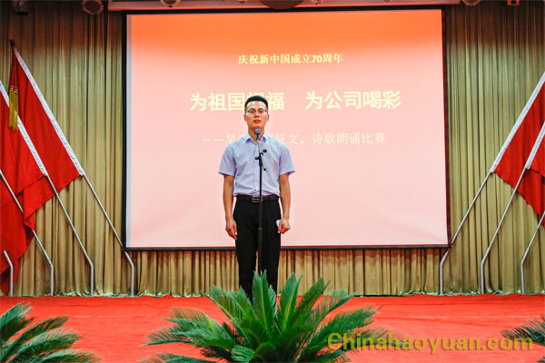 為慶祝新中國成立70周年,弘揚愛國主義精神,爭做時代先鋒,表達(dá)愛國、愛黨、愛昊源的真摯感情, 凝聚公司建設(shè)“百億規(guī)模、百年昊源”的精神動力,展現(xiàn)新時代工人良好形象,9月30日,由公司工會、團(tuán)委舉辦的“慶祝建國七十周年,為祖國祝福、為公司喝彩”昊源集團(tuán)演講、朗誦比賽在公司大禮堂拉開帷幕。