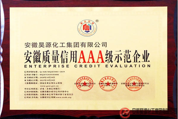 安徽省徽企質(zhì)量信用評價中心和安徽企業(yè)信用等級評價專家委員會依據(jù)GB/T23794-2015《企業(yè)信用評價指標》、Q/AH/HQXY001-2019《企業(yè)信用等級評價管理辦法》,針對昊源公司的信用記錄、經(jīng)營狀況、財務指標、發(fā)展前景,結(jié)合國家及地方相關政策,本著公平、公正、獨立、客觀、科學原則,評定安徽昊源化工集團有限公司企業(yè)信用等級為:安徽質(zhì)量信用AAA級示范企業(yè)。并為公司頒發(fā)了牌匾及證書。