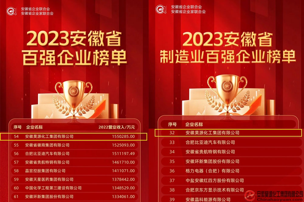 11月22日,安徽省企業(yè)聯(lián)合會和安徽省企業(yè)家聯(lián)合會聯(lián)合發(fā)文,以2022年企業(yè)營業(yè)收入為標(biāo)準(zhǔn),確定了安徽企業(yè)綜合100強(qiáng)和制造業(yè)、服務(wù)業(yè)企業(yè)100強(qiáng)。安徽昊源化工集團(tuán)有限公司榮登安徽企業(yè)綜合100強(qiáng)榜單第54名、制造業(yè)百強(qiáng)企業(yè)榜單第32名。
