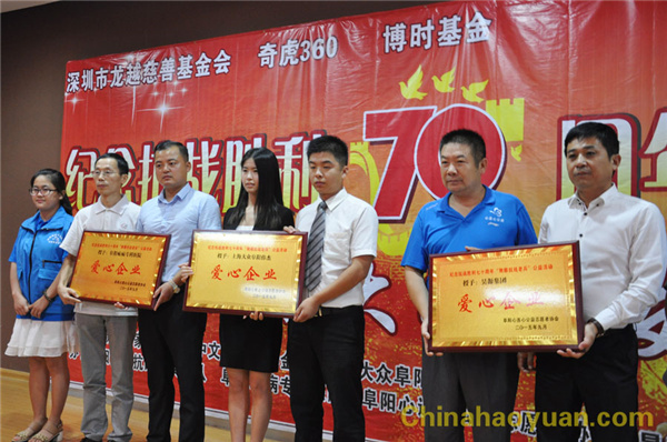 上午九時(shí),在阜陽(yáng)市疝病醫(yī)院的禮堂里,昊源集團(tuán)榮獲“紀(jì)念抗戰(zhàn)勝利70周年致敬抗戰(zhàn)老兵”活動(dòng)“愛(ài)心企業(yè)”稱號(hào),昊源集團(tuán)自七月份開(kāi)始參與“關(guān)注歷史、關(guān)愛(ài)老兵”的活動(dòng)以來(lái),工會(huì)副主席戚偉組織昊源集團(tuán)青年志愿者服務(wù)隊(duì)頂著高溫走訪二十多名抗戰(zhàn)老兵。為這些曾經(jīng)為祖國(guó)、為民族浴血奮戰(zhàn)的民族英雄送去了集團(tuán)公司的最崇高敬意。
