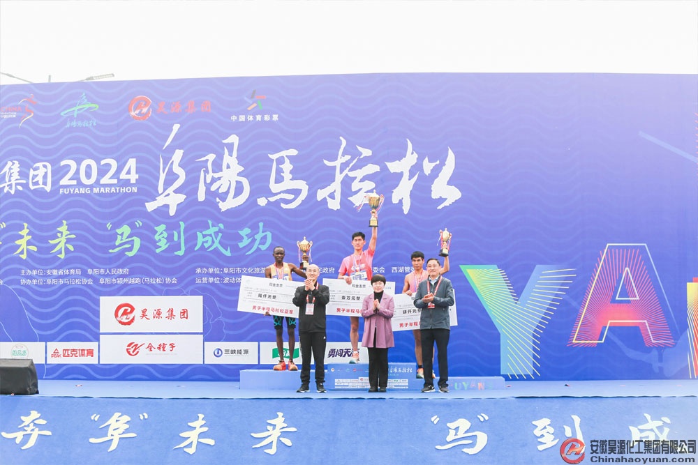 在企業(yè)授牌環(huán)節(jié),市領(lǐng)導(dǎo)為昊源公司頒發(fā)“昊源集團(tuán)”2024阜陽馬拉松官方總冠名單位獎牌。