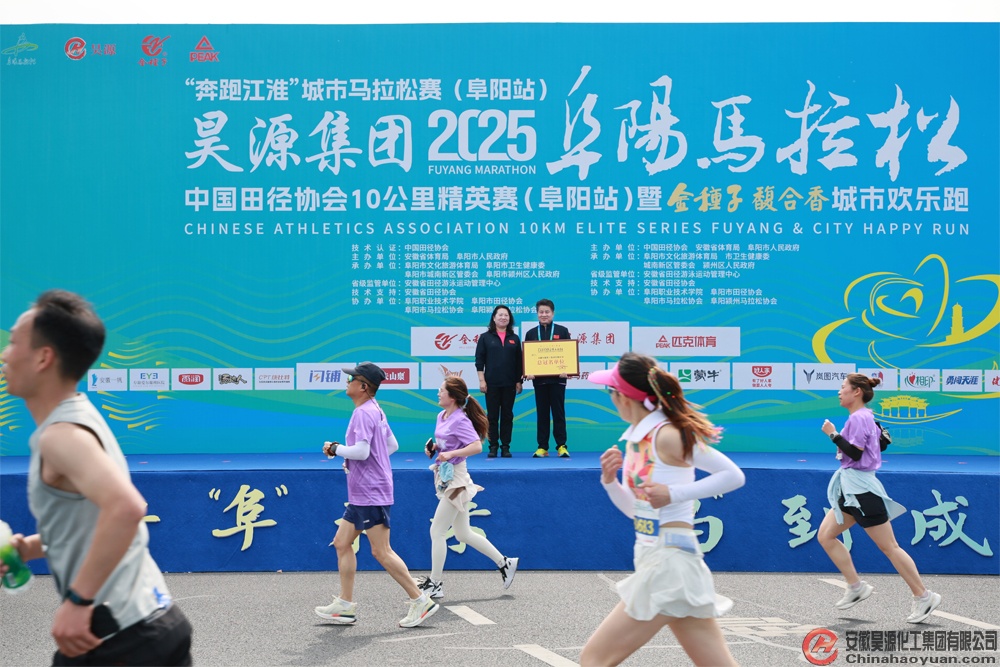 在企業(yè)授牌環(huán)節(jié),市領(lǐng)導(dǎo)代表昊源集團(tuán)2025阜陽馬拉松官方授予安徽昊源化工集團(tuán)有限公司總冠名單位獎牌。