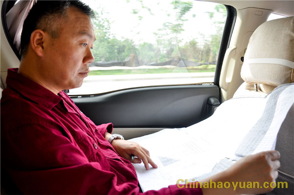 在去園區(qū)的路上,張超還在車上仔細(xì)查看圖紙。