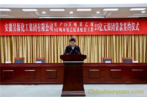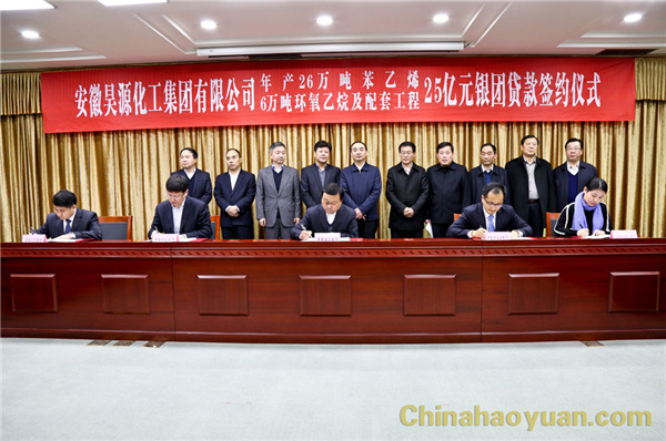 2017年1月6日上午,安徽昊源化工集團有限公司年產(chǎn)26萬噸苯乙烯、6萬噸環(huán)氧乙烷及配套工程項目25億元銀團貸款簽約儀式在阜陽市政府三樓會議室舉行。市委副書記,市政府代市長、黨組書記孫正東,市政府秘書長王顯義、副秘書長趙志賀、朱新,昊源公司黨委書記、董事長凡殿才,中國建設銀行安徽省分行、中國進出口銀行安徽省分行、中國光大銀行合肥分行、合肥科技農(nóng)村商業(yè)銀行主要負責人出席簽約儀式。