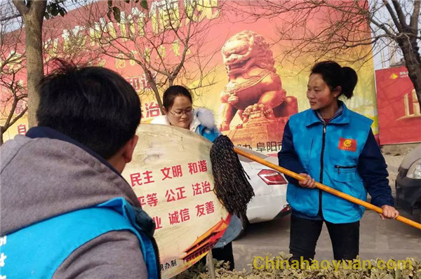 志愿者三十余人共分四隊,分別沿著北京東路、向陽路、潁河東路、阜渦路進行清理、打掃衛(wèi)生,看到傾斜的志愿標志牌,志愿者們合力把它扶正并將它擦干凈。