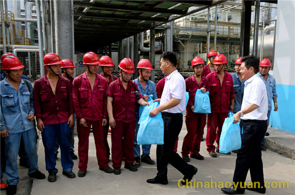 8月23日,阜陽市總工會(huì)黨組織成員、經(jīng)審會(huì)主任吳燕,勞動(dòng)保障部長徐彪一行,帶著礦泉水、綠豆、清涼大禮包等防暑降溫用品,深入昊源公司生產(chǎn)一線,為高溫期間堅(jiān)守生產(chǎn)崗位一線員工送去清涼。公司副總經(jīng)理、工會(huì)主席高玉磊,總經(jīng)理助理吳珍漢陪同。