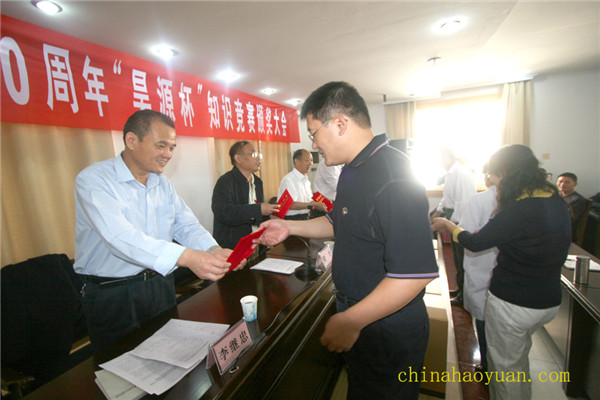 9月29日上午,慶祝建國(guó)60周年“昊源杯”知識(shí)競(jìng)賽頒獎(jiǎng)大會(huì)在阜陽(yáng)市直工委會(huì)議室隆重舉行 。阜陽(yáng)市委常委、市委秘書長(zhǎng)亓龍,安徽昊源化工集團(tuán)有限公司黨委副書記李繼忠等出席了本次頒獎(jiǎng)大會(huì)。此次知識(shí)競(jìng)賽是由市直工委、市委黨史研究室、市經(jīng)委等單位聯(lián)合組織,昊源化工集團(tuán)獨(dú)家冠名贊助舉辦。本次活動(dòng)旨在慶祝建國(guó)60周年,進(jìn)一步弘揚(yáng)愛國(guó)主義精神,讓廣大干部群眾了解黨的光輝歷史。自7月4日活動(dòng)開展以來(lái),截至9月15日止,共收到答卷2881份,其中505份全部正確。經(jīng)評(píng)審團(tuán)評(píng)審,共評(píng)出一等獎(jiǎng)5名、二等獎(jiǎng)10名、三等獎(jiǎng)20名、紀(jì)念獎(jiǎng)30名和組織獎(jiǎng)5個(gè)。圖為公司黨委副書記李繼忠向獲獎(jiǎng)選手頒獎(jiǎng)。(公司辦:朱梅)