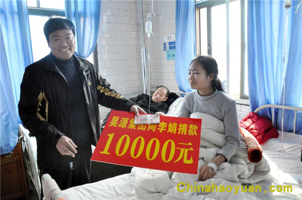 2010年2月23日,昊源集團(tuán)工會(huì)副主席王振海來到阜陽市第二人民醫(yī)院為身患骨髓增生異常綜合癥(為白血病前期綜合癥)的李娟送上一萬元慰問金,以表達(dá)昊源集團(tuán)的一片愛心。
