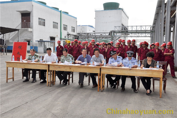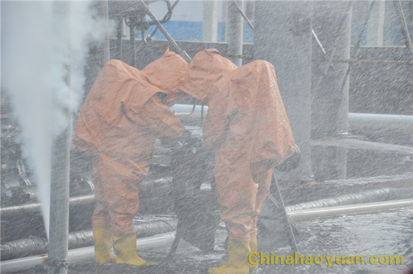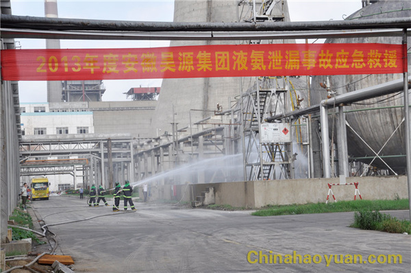 2013年6月25日下午,昊源公司“液氨泄漏反事故應(yīng)急救援演練”在公司液氨儲(chǔ)罐區(qū)進(jìn)行。此次液氨泄漏反事故應(yīng)急救援演練是“安全月”期間的一項(xiàng)重要內(nèi)容,受到上級(jí)相關(guān)部門及公司領(lǐng)導(dǎo)的高度重視。阜陽(yáng)市安監(jiān)局、質(zhì)監(jiān)局、環(huán)保監(jiān)測(cè)站及潁東公安、消防部門等單位主要領(lǐng)導(dǎo)親臨演練現(xiàn)場(chǎng)觀摩指導(dǎo)演練。演練分三個(gè)步驟進(jìn)行:一是事故發(fā)生后現(xiàn)場(chǎng)充氨車輛的應(yīng)急撤離和洗消;二是2米合成裝置停車保壓,停止放氨,相應(yīng)壓縮機(jī)停機(jī)切氣,相關(guān)合成氨系統(tǒng)進(jìn)行負(fù)荷應(yīng)急調(diào)整;三是泄漏事故部位緊急卸壓、洗消稀釋、消除漏點(diǎn)、污水回收。