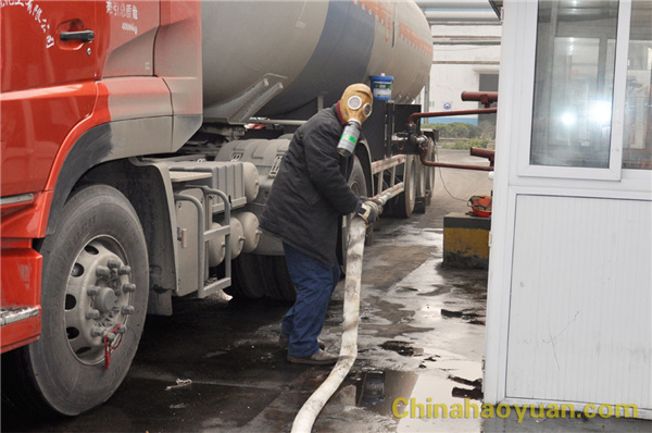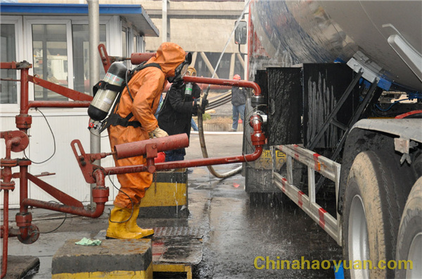 隨著車(chē)間副主任劉風(fēng)的一聲令下,各參演人員迅速進(jìn)入角色,演練正式開(kāi)始。氨庫(kù)充裝場(chǎng)地充裝人員正在對(duì)一輛槽車(chē)進(jìn)行充裝作業(yè)。充裝人員對(duì)現(xiàn)場(chǎng)的壓力、液位及靜電接地等例行巡回檢查,當(dāng)?shù)竭_(dá)槽車(chē)進(jìn)口閥處時(shí),聞到一股刺鼻的氨味,于是充裝人員戴好防氨過(guò)濾式面具,對(duì)槽車(chē)進(jìn)出口閥進(jìn)行仔細(xì)檢查。突然進(jìn)口快速接頭處噴出一股氣氨,隨即越漏越大。充裝人員試著去關(guān)閉充氨閥,但由于氨濃度越來(lái)越高,充裝人員不能靠近,隨即撤離出來(lái),緊急聯(lián)系班長(zhǎng)和車(chē)間人員。一人迅速將槽車(chē)司機(jī)緊急撤離。充裝人員及時(shí)開(kāi)啟東側(cè)消防栓,進(jìn)行霧狀噴水稀釋氨氣。此時(shí),班長(zhǎng)已穿戴好輕型防化服和呼吸器進(jìn)入現(xiàn)場(chǎng),他首先關(guān)閉充氨閥、回氣閥。同時(shí),車(chē)間人員戴好面具,從槽車(chē)尾部拉下油頂切斷槽車(chē)外漏源。隨后,班長(zhǎng)又關(guān)閉槽車(chē)進(jìn)出口閥。關(guān)閉相關(guān)閥門(mén)后漏點(diǎn)消除,班長(zhǎng)隨即拆掉充裝快速接頭后發(fā)現(xiàn)密封圈壞,于是更換密封圈。經(jīng)再次檢查確認(rèn)無(wú)隱患后,連接好接頭繼續(xù)充裝,演練結(jié)束。