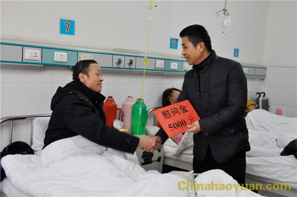 公司領(lǐng)導(dǎo)得知這個(gè)消息后,對(duì)范茂啟一家的生活十分牽掛。2014年1月20日上午,工會(huì)副主席戚偉、楊波及制氣公司經(jīng)理吳萬義等一行,代表公司來到阜陽市腫瘤醫(yī)院探望正在后續(xù)治療的范茂啟,并送去5000元慰問金。