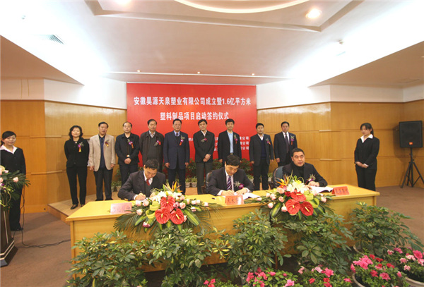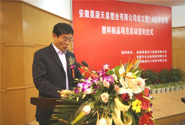 2008年4月22日上午9時18分,在阜陽市政府三樓一號會議室,隆重舉行安徽天大企業(yè)(集團)有限公司、安徽臨泉化工股份有限公司、安徽昊源化工集團有限公司合作成立安徽昊源天泉塑業(yè)有限公司簽約儀式暨建設(shè)1.6億平方米塑料制品生產(chǎn)線啟動儀式。