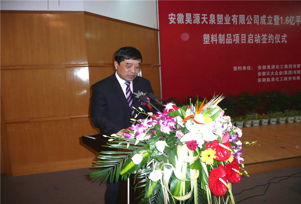 阜陽市委書記、市人大常委會主任宋衛(wèi)平,市委副書記、市長孫云飛,市委常委、市委秘書長亓龍,市委常委、副市長王海彥,市人大常委會副主任儲金水,市政協(xié)副主席、市政府秘書長李子鵬,市政協(xié)副主席肖軍。安徽天大企業(yè)(集團)董事長葉世渠,總工程師江干,總經(jīng)理周永軍。安徽昊源化工集團有限公司董事長饒金鐸,總經(jīng)理劉博。安徽臨泉化工股份有限公司董事長張兆振,總經(jīng)理于濤。市有關(guān)部門負責同志參加簽約儀式,共同見證安徽昊源天泉塑業(yè)有限公司簽約及1.6億平方米塑料制品生產(chǎn)線啟動。