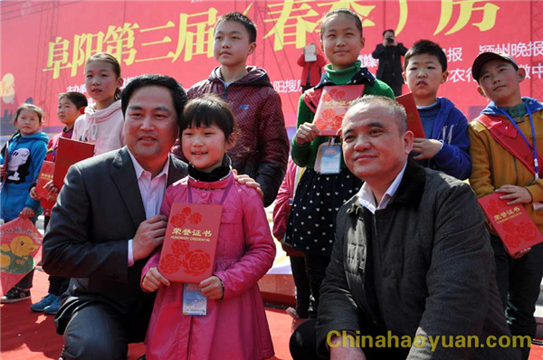 《阜陽日報》社社長張洪、昊源公司黨委副書記李繼忠與獲獎小記者合影