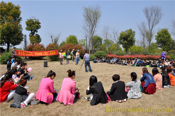 不知不覺經(jīng)過兩個小時的行駛,我們終于到達(dá)了本次活動的目的地:潁上濕地公園。望著對面一群群時尚靚麗的女孩,我們公司男生頓時興致高昂,此時,在團(tuán)委書記馮婷婷的帶頭組織下,大家選取公園一角,圍坐成一圈,在相互介紹姓名和愛好后,開始了愉快的游戲時光,“昊京香”三家公司男女生互相搭配,默契的完成了一系列游戲動作。