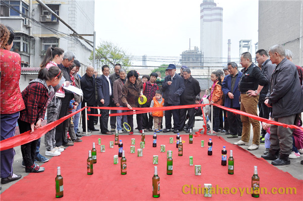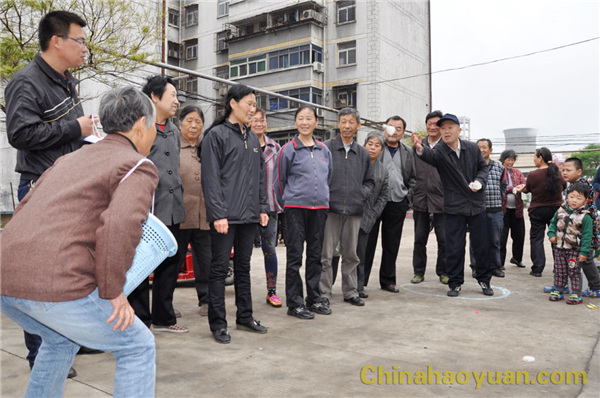 運(yùn)動會項(xiàng)目為心靈手巧 (快樂套圈游戲)、心花怒放(吹乒乓球游戲)、心有靈犀(投擲羽毛球游戲)、心明眼亮(投筷子入啤酒瓶比賽)等四個項(xiàng)目, 100多名退休老職工參加趣味比賽。