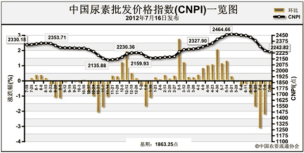上周(7月9日-7月13日)尿素市場(chǎng)受夏季追肥和出口影響,市場(chǎng)價(jià)格漲跌互現(xiàn)。7月16日CNPI為2242.82點(diǎn),環(huán)比下跌14.50點(diǎn),跌幅為0.64%;同比下跌87.36點(diǎn),跌幅為3.75%;比基期上漲379.57點(diǎn),漲幅為20.37%。CNPI已連續(xù)8周下跌,且跌勢(shì)趨緩。